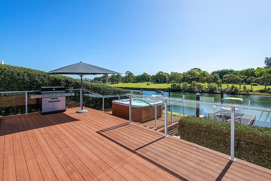The spacious designer kitchen features stone countertops, illuminated granite accents, a gas cooktop, an integrated wine fridge, and a large walk-in pantry. The seamless indoor/outdoor living space is equipped with sliding doors, making it perfect for year-round entertaining, complete with a custom BBQ area and bar. The expansive deck at the rear offers stunning panoramic views of the canal, perfect for unwinding in the heated spa.